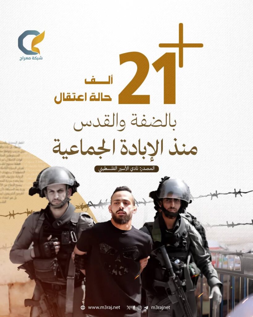 قال نادي الأسير الفلسطيني إن سلطات الاحتلال الإسرائيلي، تواصل تصعيد عمليات الاعتقال الممنهجة بشكل غير مسبوق بعد حرب الإبادة الجماعية، والتي طالت نحو 21 ألف حالة اعتقال من الضفة بما فيها القدس، إلى جانب الآلاف من قطاع غزة.