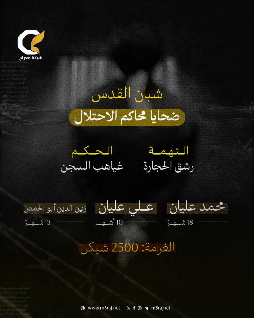 وقالت مصادر محلية إن محكمة الاحتلال حكمت على الشاب محمد عليان بالسجن الفعلي 18 شهرًا، والفتى علي عليان 10 أشهر، والفتى زين الدين أبو الحمص 13 شهرًا وغرامة مالية 2500 شيكل لكل منهم.
