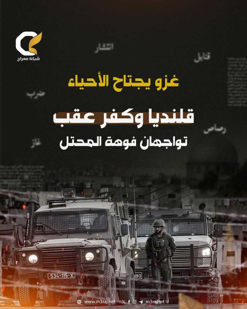وذكرت أن قوات الاحتلال أغلقت معبر قلنديا أمام الداخلين إلى مدينة القدس، وسط حصار مشدد على شوارع البلدة والمخيم، في حملة مستمرة تهدف إلى زرع الرعب بين الأهالي.
