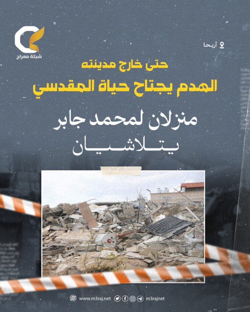 هدمت قوات الاحتلال الإسرائيلي اليوم منزلين للمقدسي محمد جابر في منطقة المطار بمدينة أريحا.