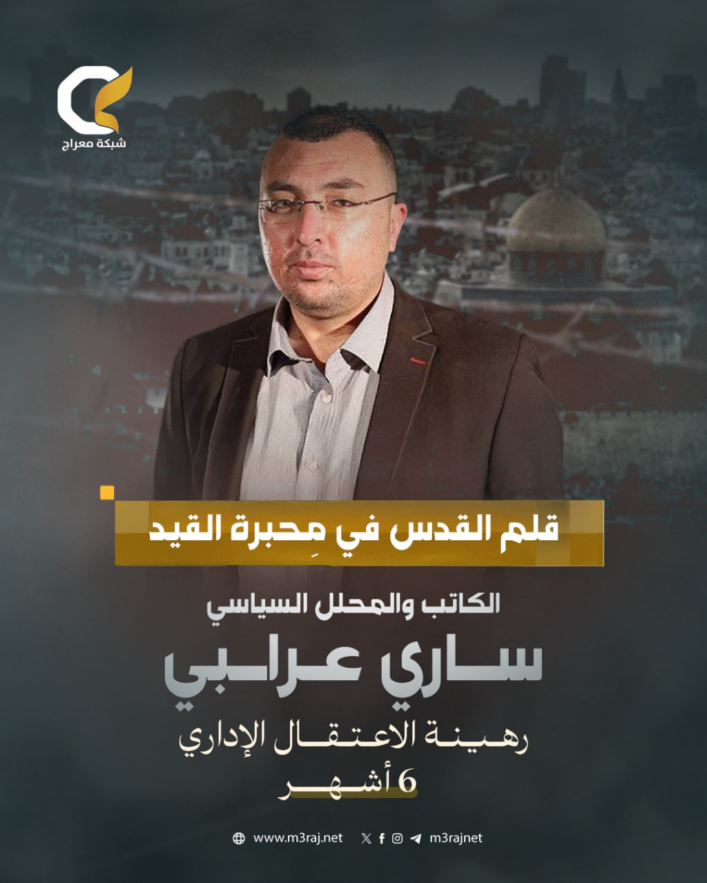 أصدرت سلطاتُ الاحتلال الإسرائيلي قرارًا يقضي بتحويل الكاتب والمحلل السياسي المقدسي ساري عرابي إلى الاعتقال الإداري لمدة 6 أشهر، في خطوة جديدة تعكس سياسة تكميم الأفواه واستهداف الأصوات الفكرية والإعلامية الفلسطينية.