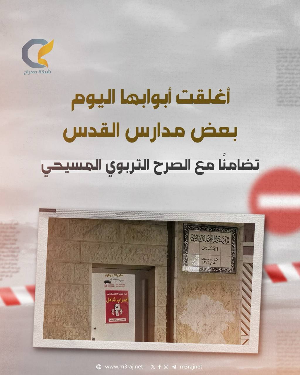 أغلقت بعض مدارس القدس أبوابها اليوم تضامنًا مع الأمانة العامة للمؤسسات التربوية المسيحية، احتجاجًا على سياسات الاحتلال التي حجبت تصاريح دخول عدد من المعلمين إلى المدينة.