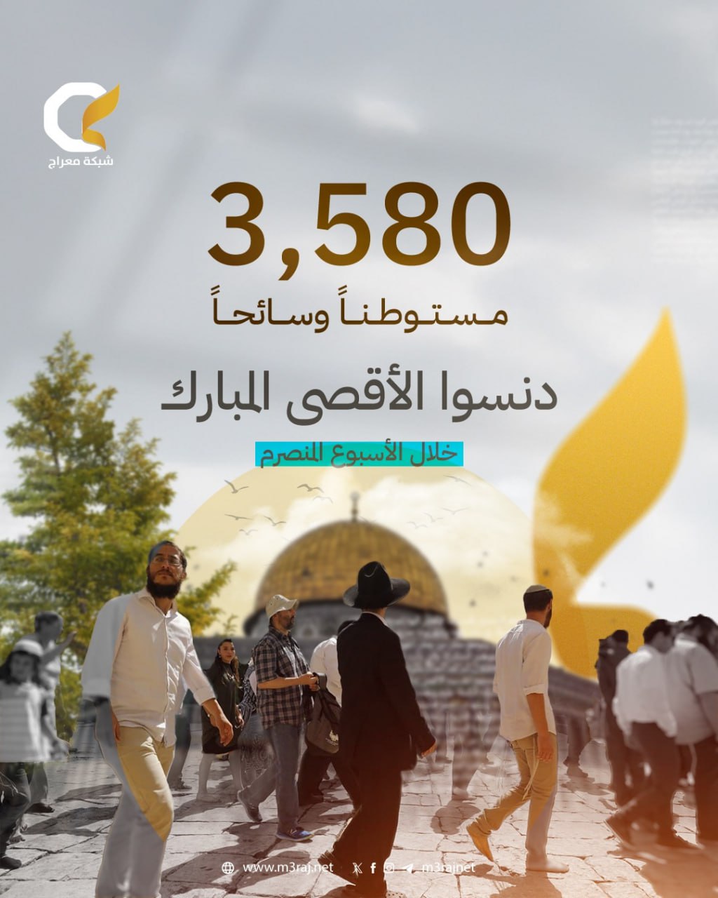 وبحسب مصادر محلية، بلغ عدد المقتحمين المتطرفين خلال الأسبوع أكثر من 2,306 مستوطنًا ومقتحماً تحت غطاء السياحة، حيث نظموا جولات استفزازية وأدوا طقوسهم التلمودية في باحاته.