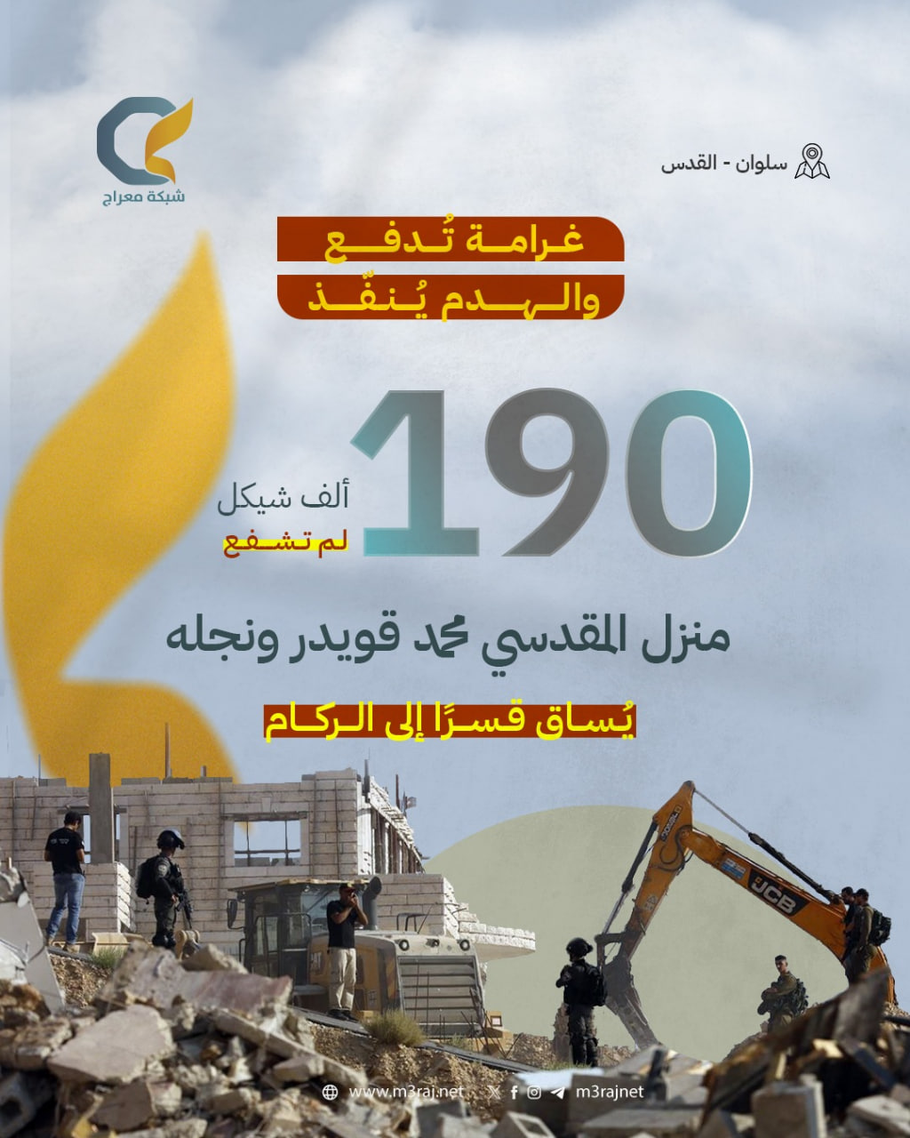 هكذا يمارس الاحتلال سياسته المزدوجة بحق المقدسيين: جباية قسرية للأموال تحت مسمى الغرامات والمخالفات، ثم هدم بلا رحمة للمنازل والممتلكا، إنها معادلة ظالمة تهدف إلى إنهاك المقدسيين اقتصاديًا، ودفعهم نحو الرحيل القسري.