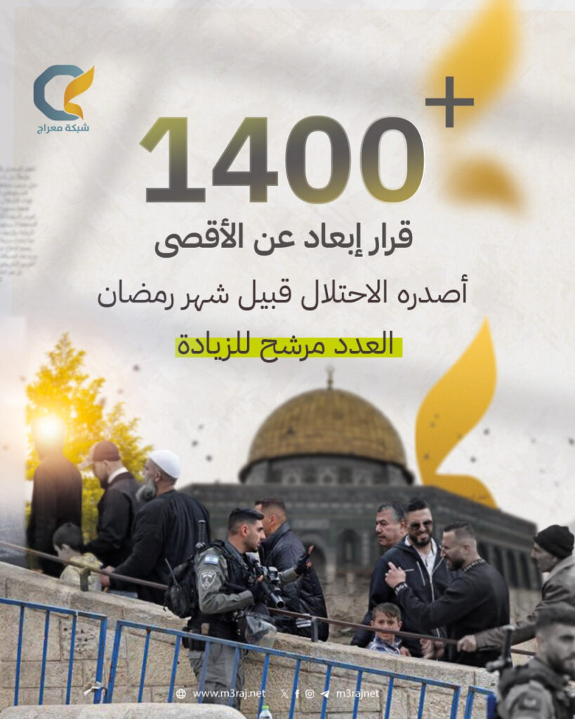 ووفق مصادر محلية، فقد أصدر الاحتلال أكثر من 1400 قرار إبعاد عن الأقصى حتى الآن، في مؤشر خطير على محاولة تفريغ المسجد من روّاده في شهر الطاعة والروحانية.