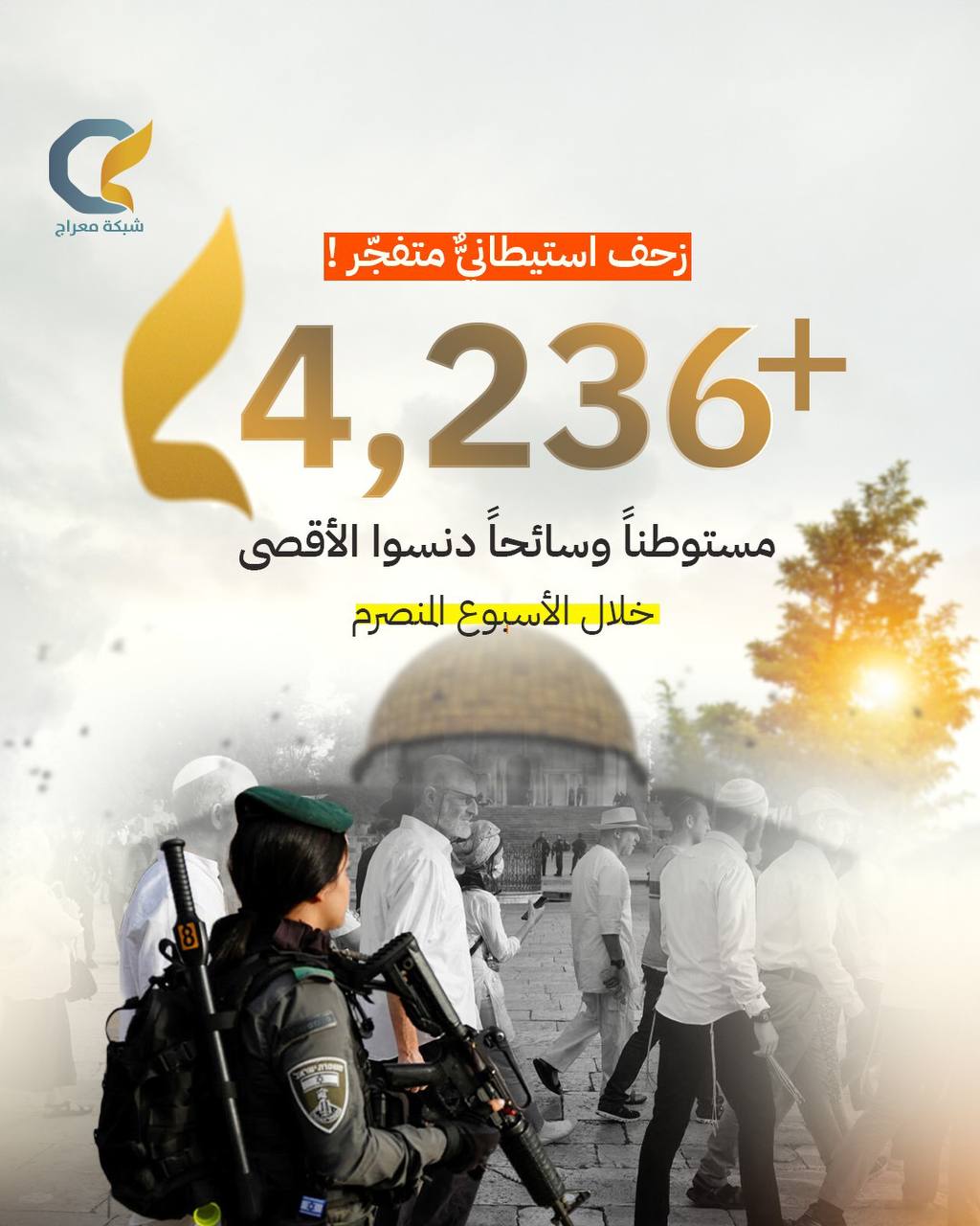 وبحسب مصادر محلية، بلغ عدد المقتحمين المتطرفين خلال الأسبوع أكثر من 4236 مستوطنًا ومقتحماً تحت غطاء السياحة، حيث نظموا جولات استفزازية وأدوا طقوسهم التلمودية في باحاته.