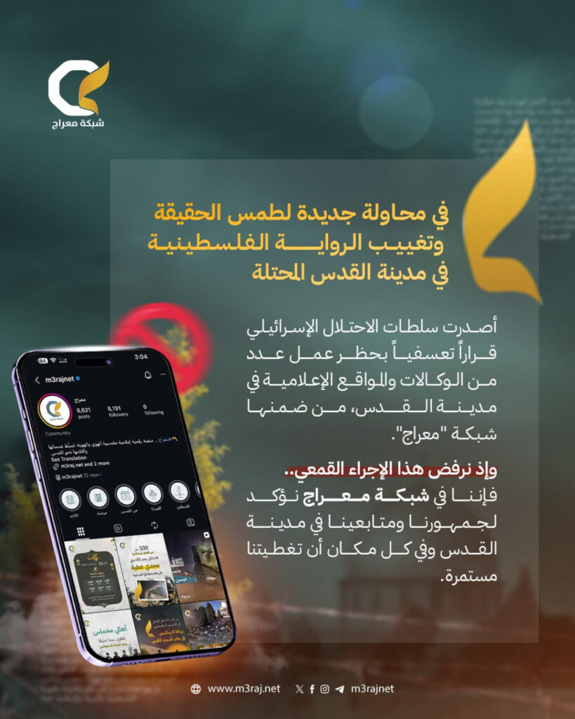 في محاولة جديدة لطمس الحقيقة وتغييب الرواية الفلسطينية في مدينة القدس المحتلة، أقدمت سلطات الاحتلال الإسرائيلي على إصدار قرار تعسفي يقضي بحظر عمل عدد من الوكالات والمواقع الإعلامية في المدينة، من بينها شبكة معراج.