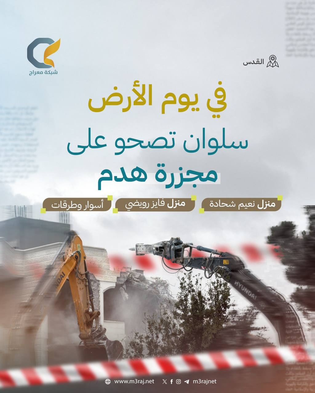 اقتحمت جرافات الاحتلال “الإسرائيلي” بلدة سلوان جنوب المسجد الأقصى المبارك، صباح اليوم، تزامنًا مع الذكرى الـ50 ليوم الأرض، وشرعت في تنفيذ عمليات هدم طالت منازل وممتلكات المقدسيين، ضمن تصعيد جديد يستهدف الوجود الفلسطيني في المنطقة.