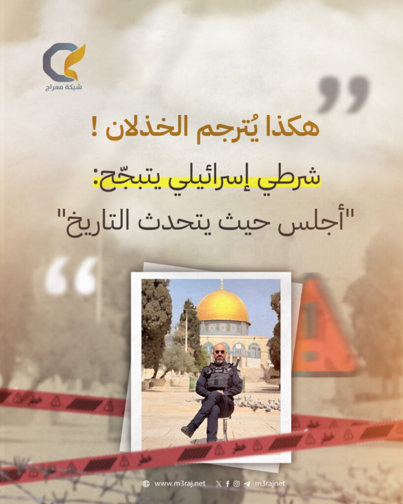 دنّس شرطي إسرائيلي المسجد الأقصى المبارك، والتقط صورة أمام قبة الصخرة المشرفة، نشرها عبر منصاته بتبجّح، مرفقًا إياها بعبارة: “نجلس في المكان الذي يتحدث عنه التاريخ”.
