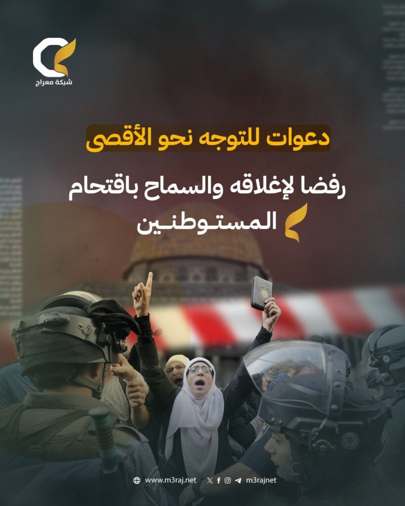 وتأتي هذه الدعوات في ظل تصاعد الإجراءات الإسرائيلية بحق المسجد الأقصى، حيث اقتحم وزير الأمن القومي الإسرائيلي إيتمار بن غفير، مساء الاثنين، باحات المسجد ونفّذ جولة داخله، رغم الإغلاق المتواصل، في خطوة خطيرة تمهّد لفرض واقع جديد في المكان.