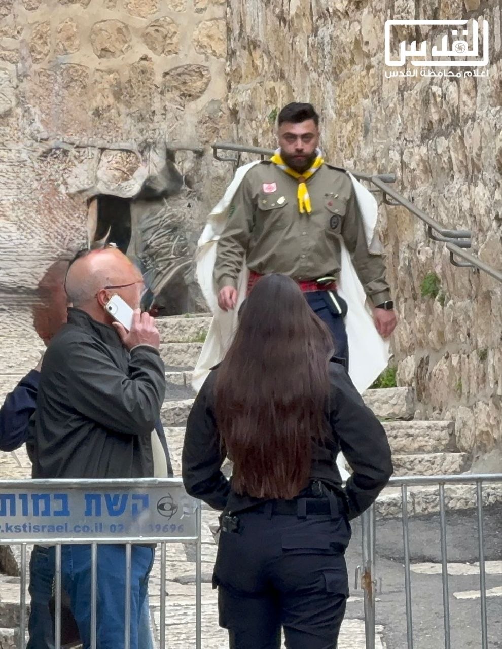 أزالت قوات الاحتلال الإسرائيلي، اليوم السبت، العلم الفلسطيني المعلق على زي الكشافة في القدس المحتلة، لمناسبة إحياء الكنائس المسيحية “سبت النور”، في كنيسة القيامة.