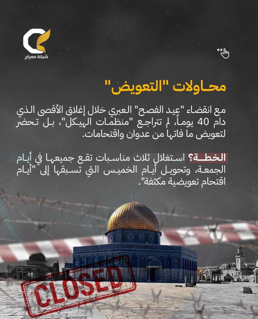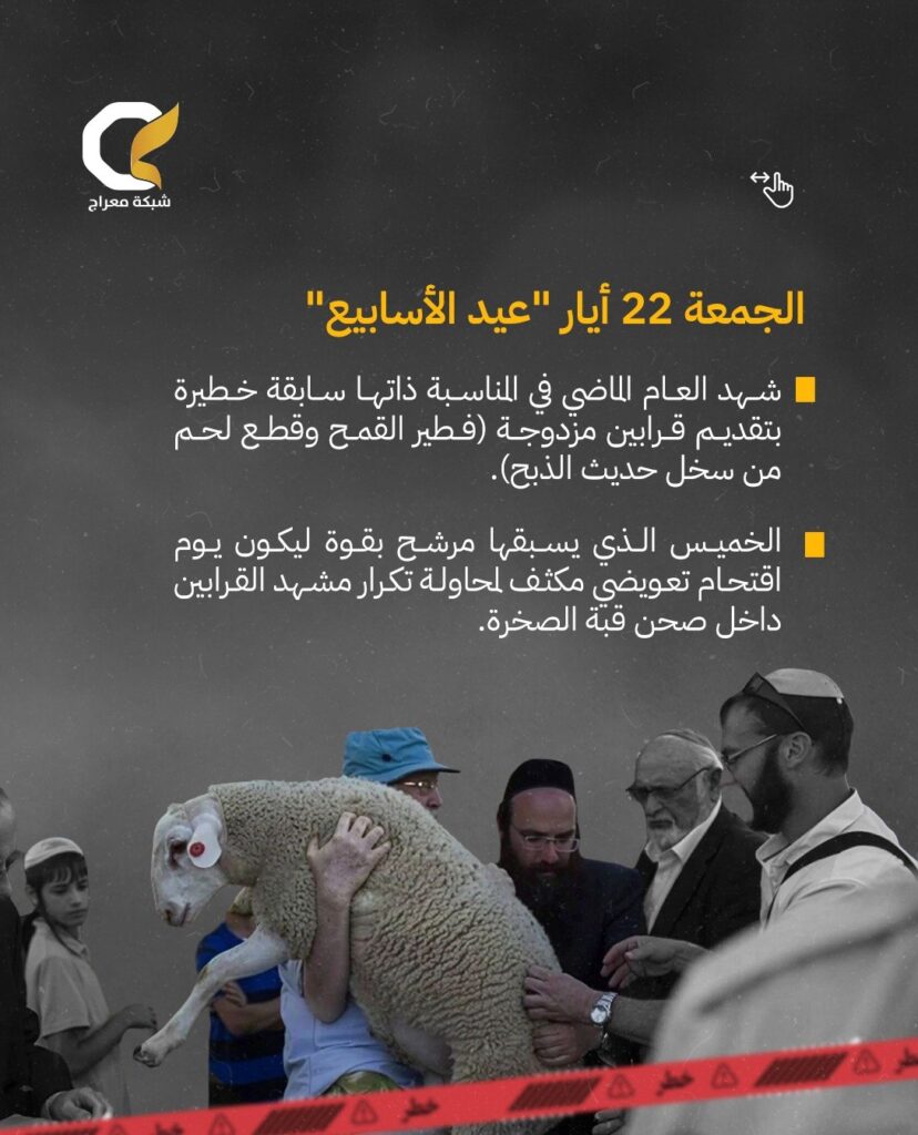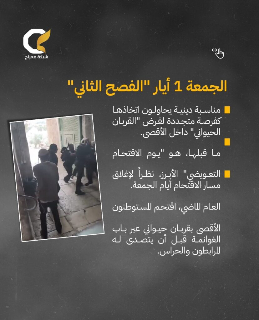 أول هذه المحطات ما يُسمى “عيد الفصح الصغير” في الأول من مايو/أيار، والذي تسعى خلاله مجموعات متطرفة إلى إدخال “القرابين” إلى داخل الأقصى، في خطوة تعتبرها هذه الجماعات جزءًا من تمهيد ديني مزعوم لإقامة “الهيكل الثالث”.