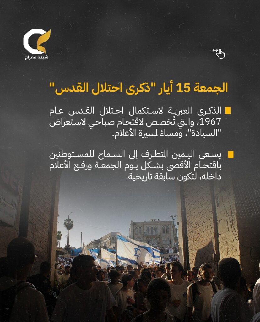 أما المحطة الثانية فهي “يوم توحيد القدس” في 16 مايو/أيار، والذي يحيي ذكرى احتلال الجزء الشرقي من المدينة عام 1967، ويتحول عادة إلى ذروة في الاقتحامات والمسيرات الاستفزازية داخل البلدة القديمة، وصولًا إلى محيط المسجد الأقصى وحائط البراق، بمشاركة شخصيات سياسية ودينية بارزة من اليمين الإسرائيلي.