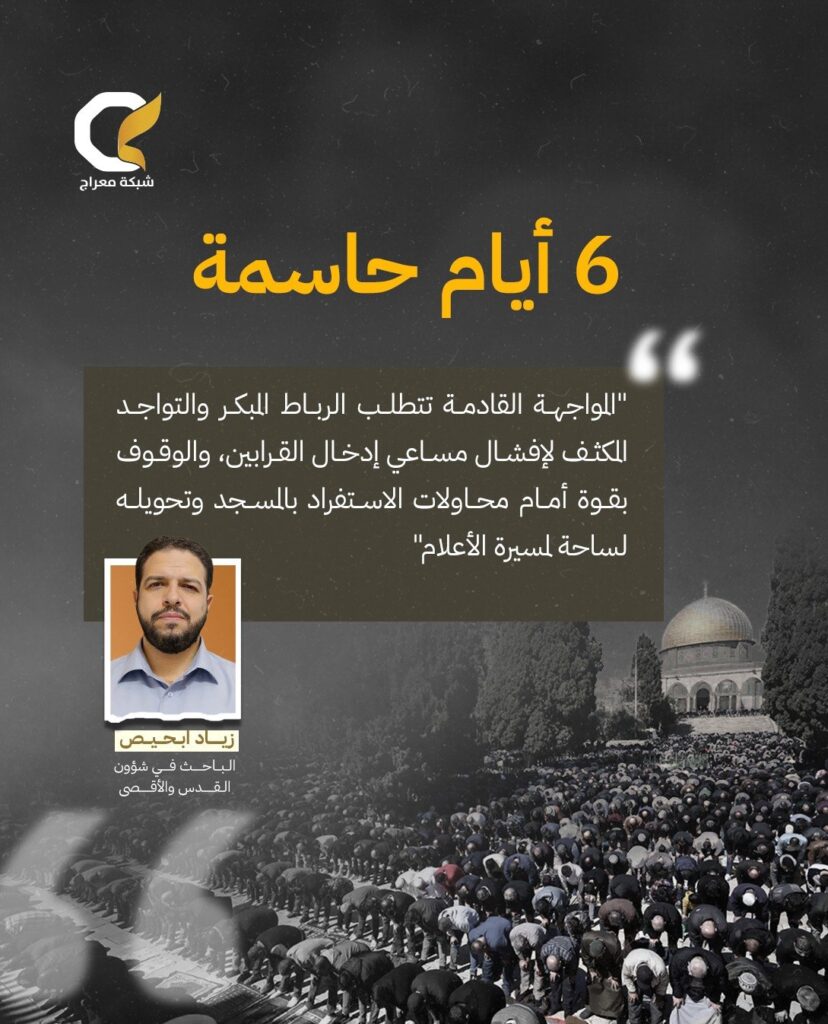 ويشير إلى أن الاقتحامات المرتقبة ستتوزع على ثلاثة محطات رئيسية تتقاطع مع مناسبات دينية يهودية، ما يضاعف من حجم المخاطر على الوضع القائم في المسجد.