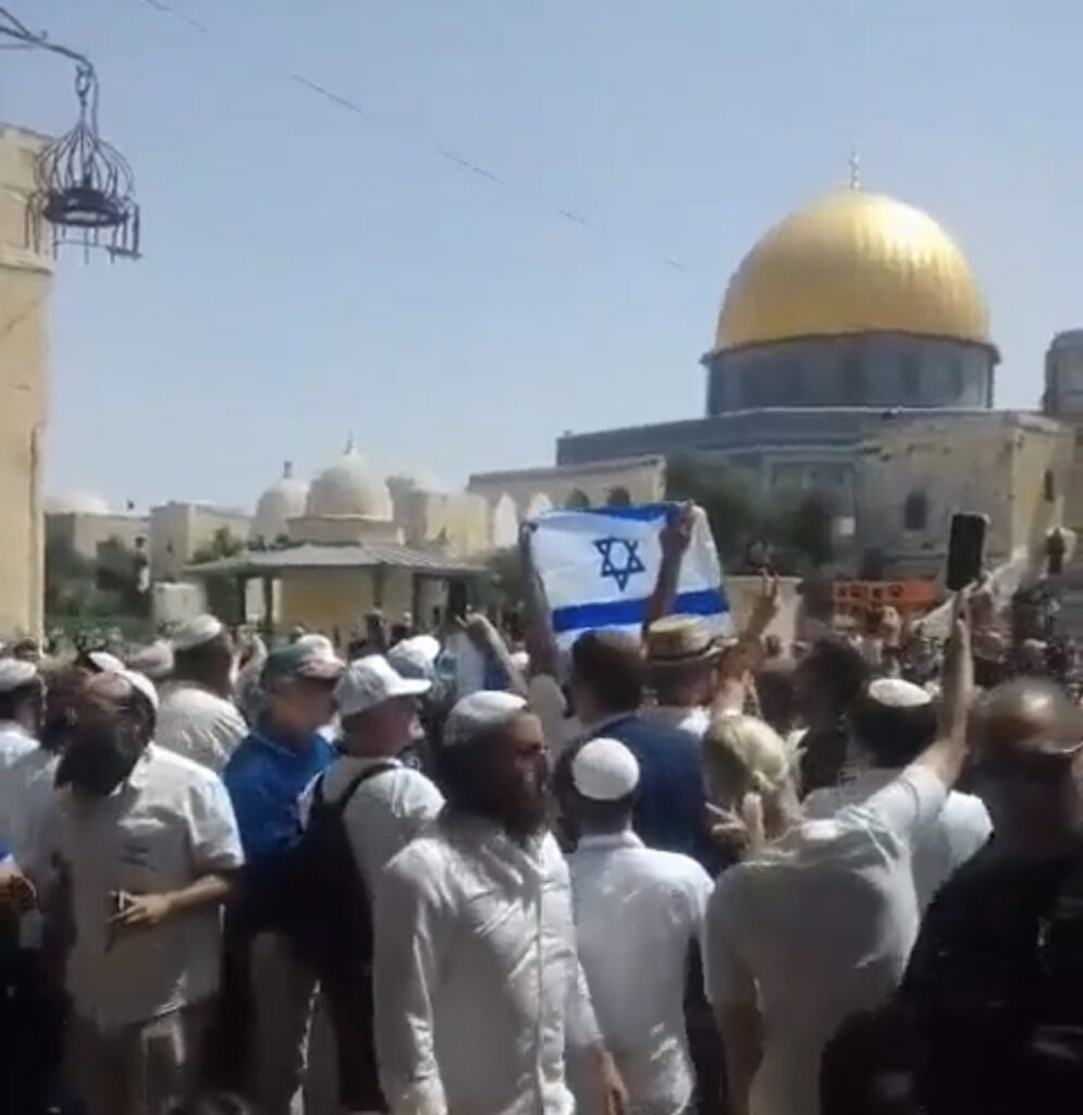 قام مجموعة من المستوطنين اليوم الأحد 29 مايو، برفع العلم الإسرائيلي أثناء اقتحامهم باحات المسجد الأقصى المبارك بشكل استفزازي أمام المرابطين والمرابطات.