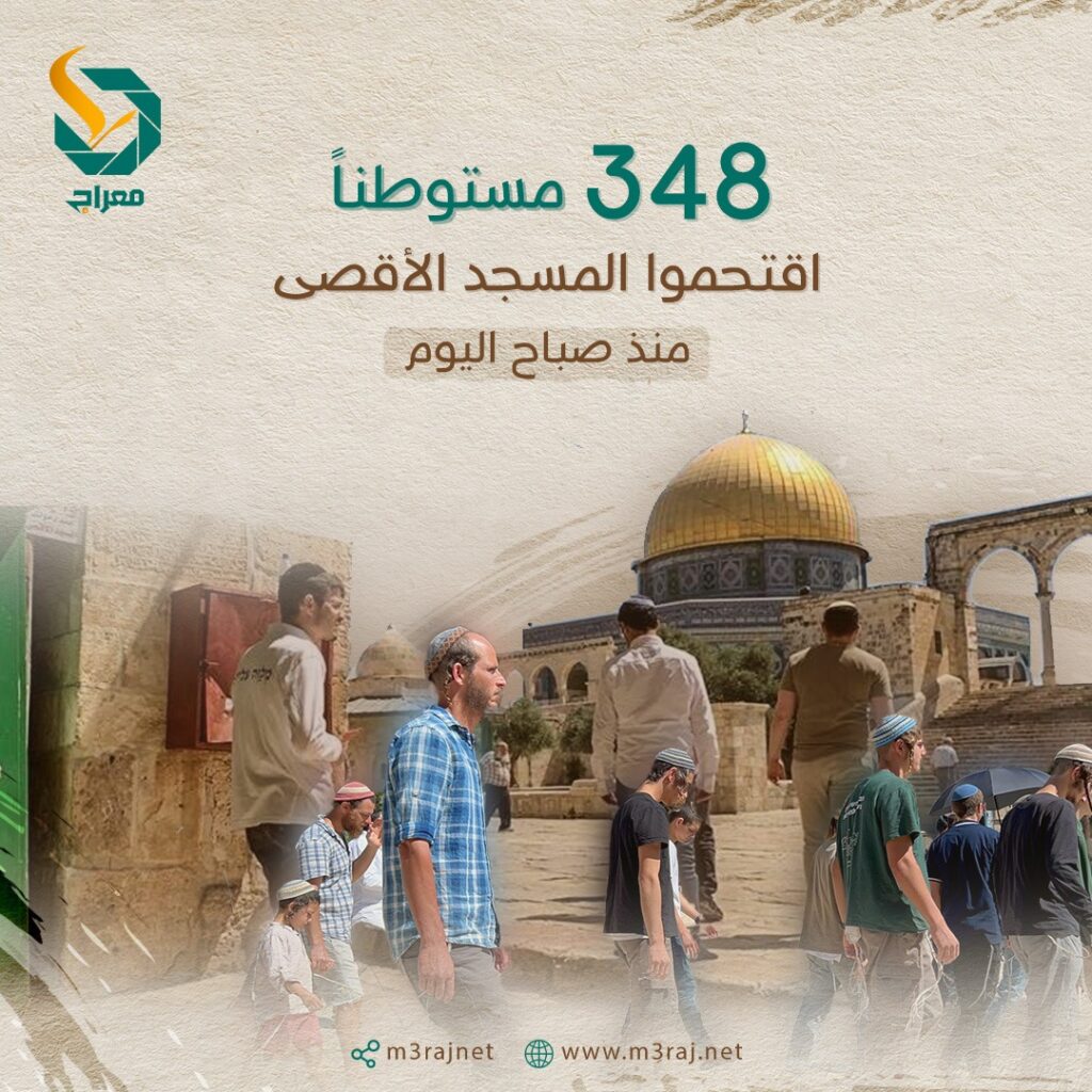 وذكرت دائرة الأوقاف الإسلامية في القدس المحتلة أن 224 مستوطنا اقتحموا الاقصى خلال الفترة الصباحية، بيننا اقتحمه 124 مستوطنا في الفترة المسائية، ونظموا جولات استفزازية في باحته، وتلقوا شروحات حول “الهيكل” المزعوم، وأدوا طقوسا تلمودية في منطقة باب الرحمة في المنطقة الشرقية للأقصى.
