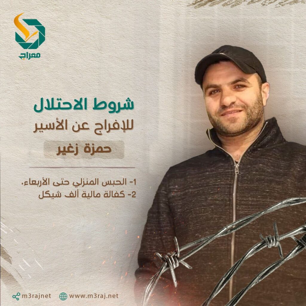 قررت سلطات الاحتلال الإسرائيلي، يوم الأحد، الإفراج عن الأسير المقدسي حمزة بدر الزغير من البلدة القديمة في القدس المحتلة، بشرط تحويله للحبس المنزلي لغاية يوم الأربعاء القادم، ودفع كفالة مالية بقيمة ألف شيقل.