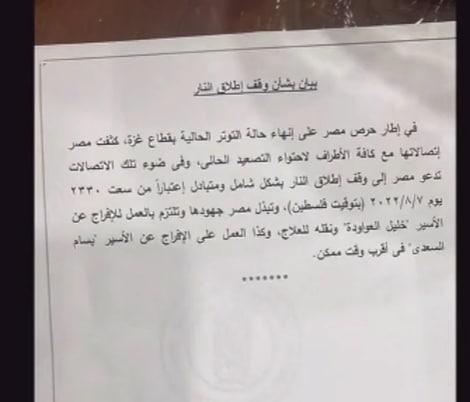 صرح مصدر مصري مسؤول، مساء اليوح الاحد، بانه في إطار حرص مصر على إنهاء حالة التوتر الحالية في قطاع غزة، كثفت مصر اتصالاتها مع كافة الأطراف لاحتواء التصعيد الحالي وفي ضوء تلك الاتصالات تدعو مصر إلى وقف إطلاق النار بشكل شامل ومتبادل اعتبارا من الساعة 23:30 يوم 7/8/2022 (بتوقيت فلسطين).