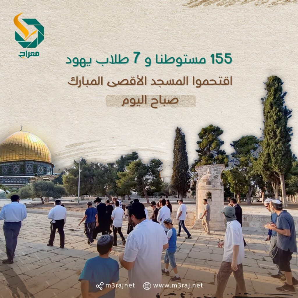 وأفادت الأوقاف الإسلامية في القدس، بأن 155 مستوطنا و7 طلاب يهود، اقتحموا المسجد الأقصى من جهة باب المغاربة على شكل مجموعات متتالية، وأدوا طقوسا تلمودية ونفذوا جولات استفزازية في باحاته، واستمعوا لشروحات حول هيكلهم المزعوم.