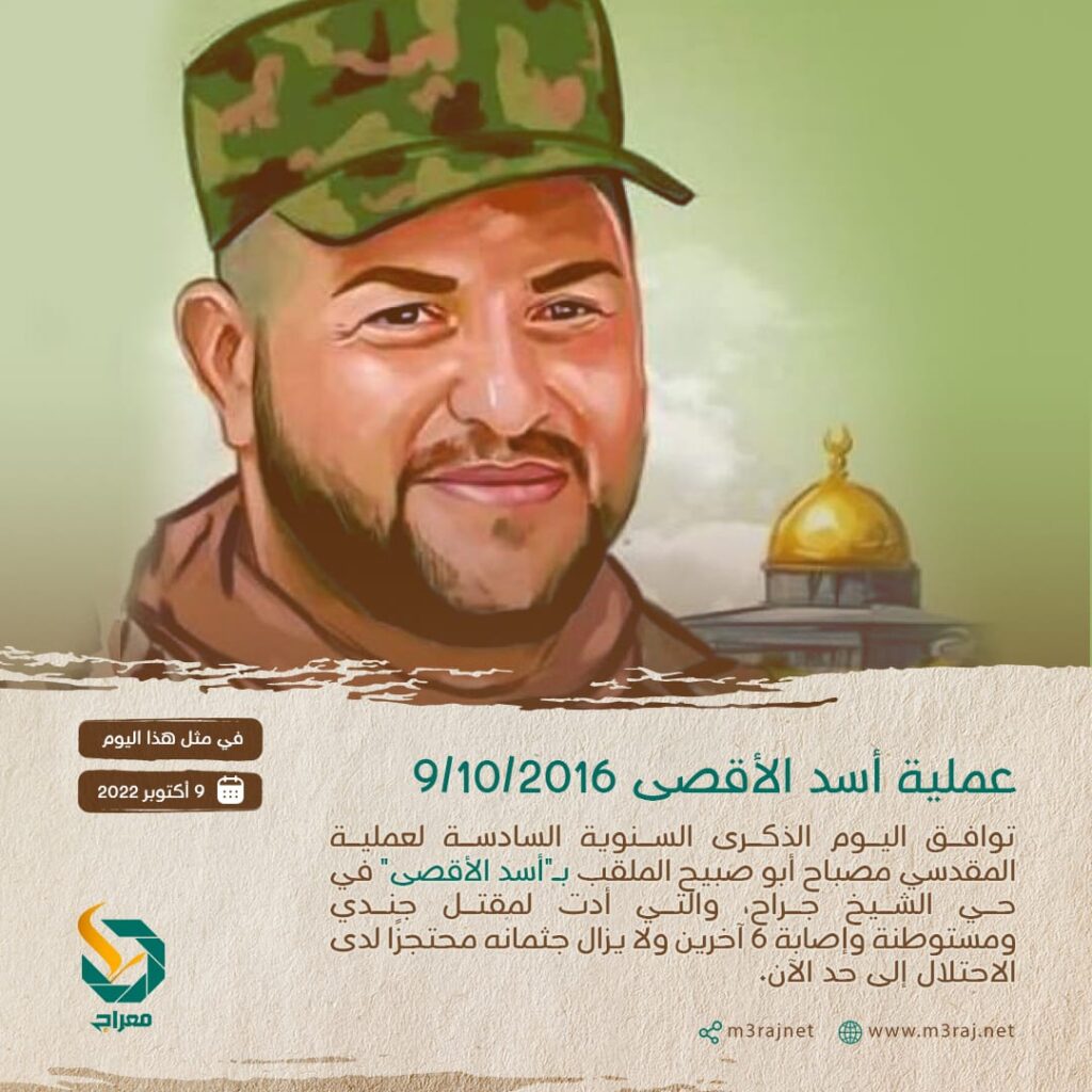 توافق اليوم الذكرى السنوية السادسة لاستشهاد المجاهد المقدسي مصباح أبو صبيح، بعد أن نفّذ عملية دهس وإطلاق نار مزدوجة في مدينة القدس المحتلة، يوم التاسع من تشرين أول/أكتوبر 2016، والتي أسفرت في حينها عن مقتل مستوطنيْن وإصابة آخرين.